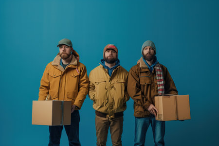 Three men wearing jackets and hats are standing in front of a blue background. They are holding boxes and appear to be posing for a photo. Scene is casual and friendly