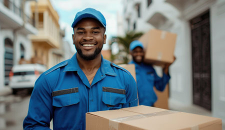Smiling delivery worker carrying cardboard box outdoors with colleague in background on a sunny day.