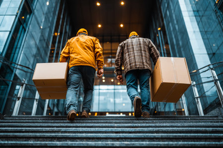 Two couriers wearing caps climb the stairs of a contemporary building while carrying large boxes. Their teamwork shows the effort involved in delivery tasks.