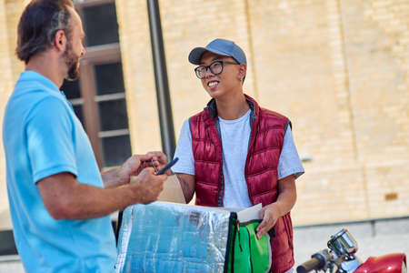 Delivery mail man giving parcel box to recipient, Young man signing receipt of delivery package from post shipment courier at home.