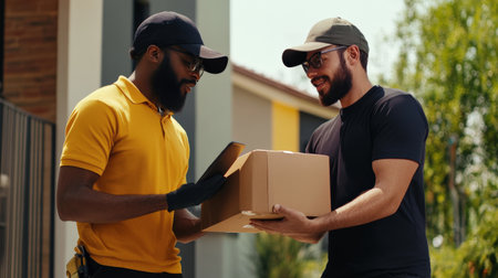 A cheerful delivery man receives a package from a smiling customer by a van. The scene captures the essence of a successful and friendly delivery process.