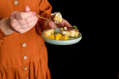 A piece of delicious cake in the hands of a girl on a beautiful plate with a spoon. The girl tries a piece of cake.