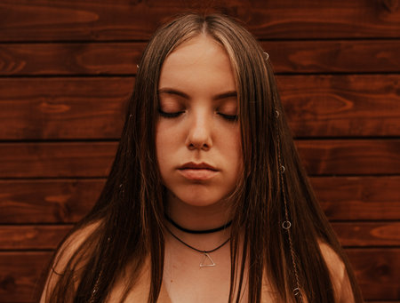 A young woman with long, dark hair looks thoughtfully into the distance against a blurred blue background.