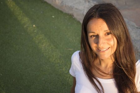 Bright smile of a young woman enjoying sunlight in a warm outdoor setting during the afternoon