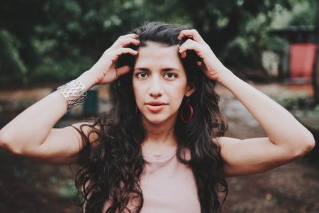 A young woman with long, dark, wavy hair and striking makeup looks thoughtfully out a window, framed by lush green foliage. She wears a white lace-trimmed top and large, yellow tassel earrings, suggesting a moment of quiet contemplation or artistic inspiration.