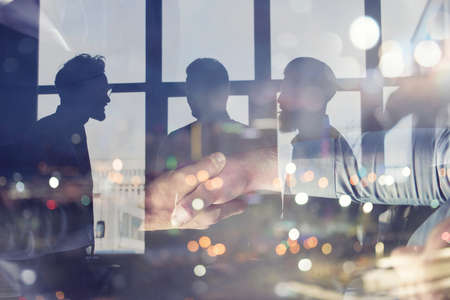 Handshaking business person in office. concept of teamwork and partnership. double exposure