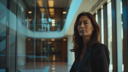 Beautiful businesswoman looking at camera in corridor of modern office building