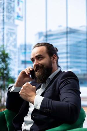 Young entrepreneur makes an important phone call to a senior consultant, going over some business growth ideas and investment opportunities. Director and shareholders on a secure line.