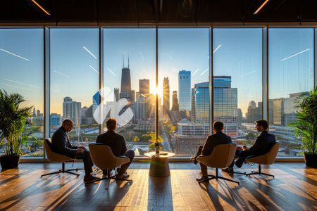 Business meeting in a modern office with city skyline view at sunset.