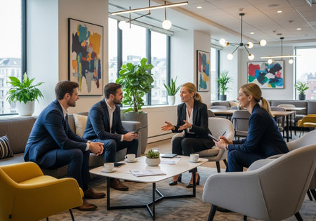 Professionals engage in a collaborative meeting, showcasing teamwork and leadership in a contemporary office setting filled with natural light and modern furnishings.
