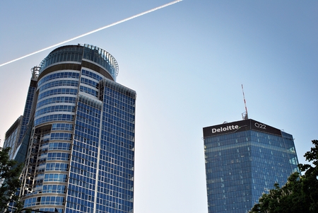 BELGRADE, SERBIA - JULY 11, 2018: Logo of Deloitte on their main office building in Belgrade. Deloitte is one of the main audit firms in the world, within the Big Four Group