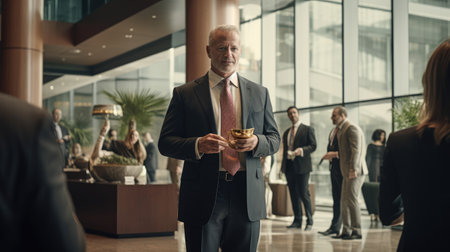 In a corporate lobby adorned with accolades a CEO offers a commendation to a distinguished executive acknowledging their substantial impact on the company's growth and success.