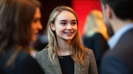 A young woman smiles while engaging in a lively conversation at a networking event, showcasing the essence of professional interactions and social connection.
