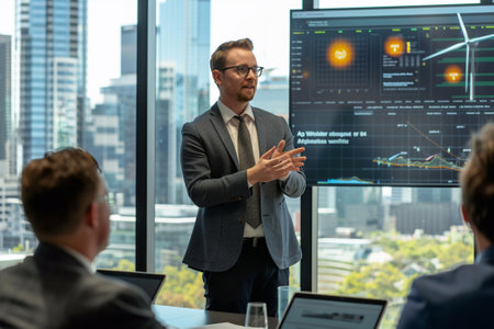A manager presents a green energy business proposal, pictures of solar energy and wind energy appear on the screen.