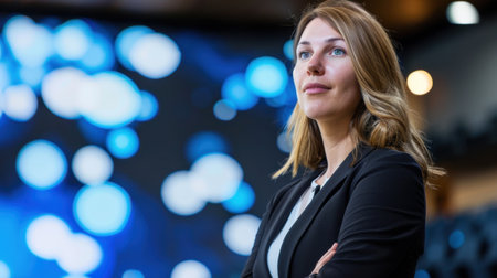 A confident businesswoman stands in a modern office space, exuding professionalism and determination. The backdrop features an abstract design with blue lights, symbolizing innovation and progress.