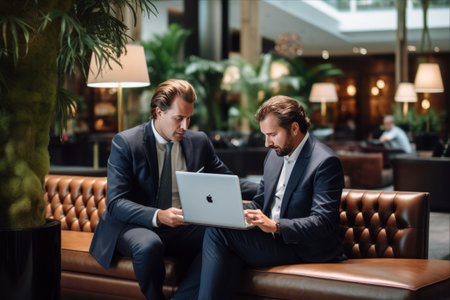 Businessmen working on a laptop in a hotel lobby. Business concept.