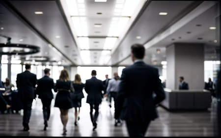 Blurred image of business people walking in the lobby of a modern office building