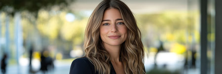 Portrait of a businesswoman smiling in front of a modern office building
