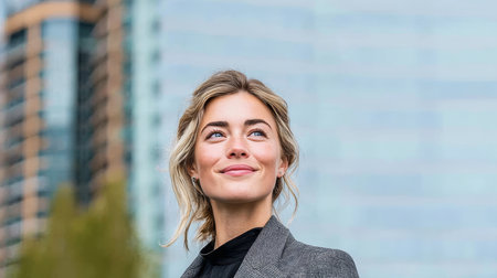Optimistic entrepreneur gazes toward a bright future, confident businesswoman in urban scene.
