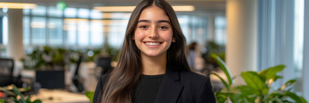 Confident young businesswoman with brunette hair smiles warmly in bright modern office setting.
