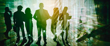 Silhouette of male leader standing with his partners while working with double exposure of finance chart and smart city background
