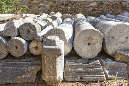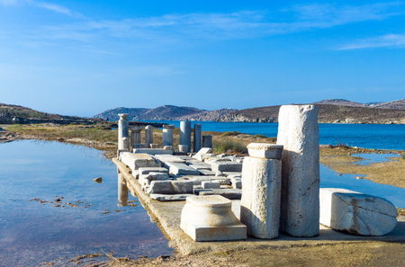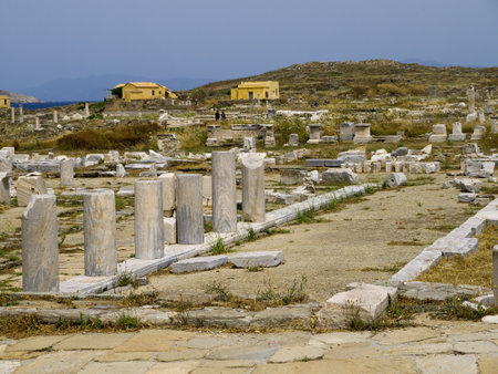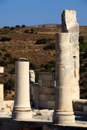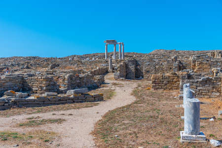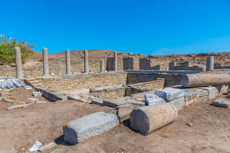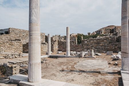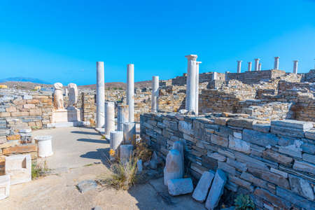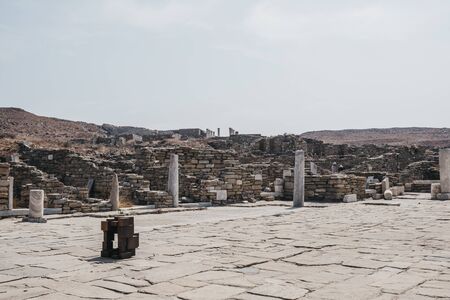 Ruins and columns on the island of Delos, Greece, an archaeological site near Mykonos in the Aegean Sea Cyclades archipelago.
