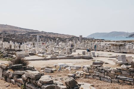 Delos, Greece - September 20, 2019: People walking amongst the ruins on island of Delos, an archaeological site in Greece near Mykonos in the Aegean Sea Cyclades archipelago.