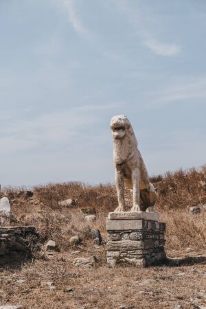 Naxian Lion statue on The Terrace of the Lions on the Greek island of Delos, archaeological site near Mykonos in the Aegean Sea Cyclades archipelago. Selective focus.