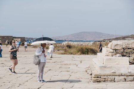 Delos, Greece - September 20, 2019: Man holding a sun umbrella looks at the ruins at Greek island of Delos, an archaeological site near Mykonos in the Aegean Sea Cyclades archipelago.
