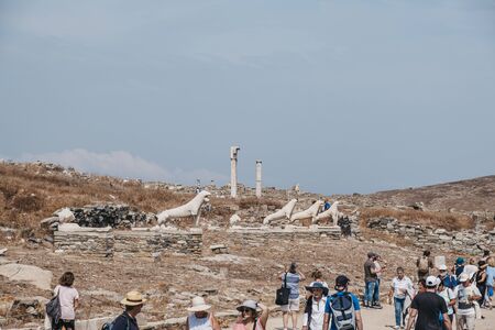 Delos, Greece - September 20, 2019: People walking past the ruins on the Sacred Way on island of Delos, an archaeological site in Greece near Mykonos in the Aegean Sea Cyclades archipelago.