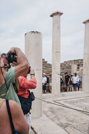 Delos, Greece - September 20, 2019: People taking photos of House of Dionysos ruins on the island of Delos, archaeological site near Mykonos in the Aegean Sea Cyclades archipelago.