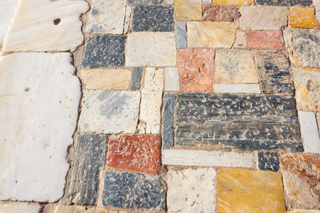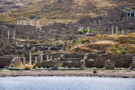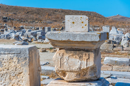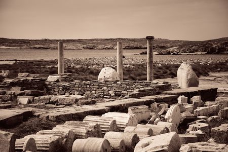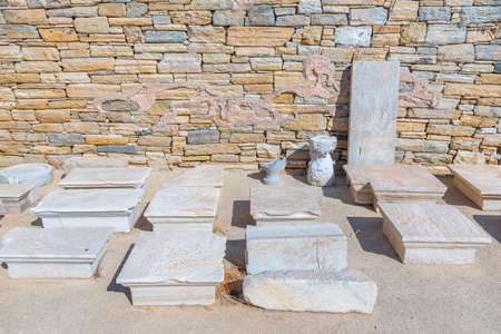 Ruins on the island of Delos, Greece, an archaeological site near Mykonos in the Aegean Sea Cyclades archipelago.