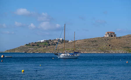 Tzia, Kea, Greece. Sailing boat moored at Vourkari cove. Island for vacation, relaxing and sea sports, blue sky background.