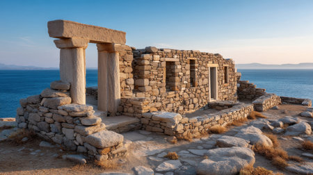 Explore the beauty of ancient stone ruins set against a stunning seascape. Calm blue waters and a clear sky enhance the serene atmosphere at sunset. Ideal for travel enthusiasts.