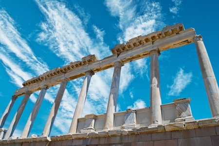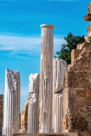 beautiful marble columns against the blue sky among the ruins of the temple of Apollo in Side (now Manavgat, Turkey)