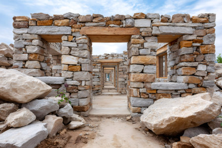 Stacked stone walls forming an unfinished house with a series of receding archways