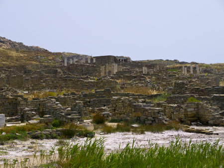 Panoramic view of the ruins on the island of Delos, Greece, an archaeological site near Mykonos in the Aegean Sea Cyclades archipelago.