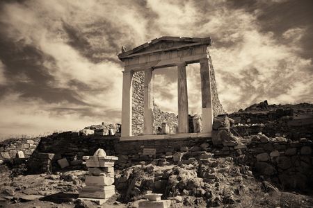 Temple in Historical Ruins in Delos Island near Mikonos, Greece.