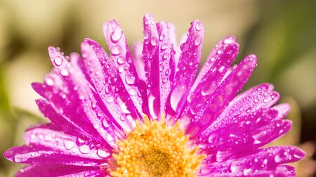 Half a purple flower. petals after the rain. beautiful summer card.Pink purple Gerbera flower with dew drops on background