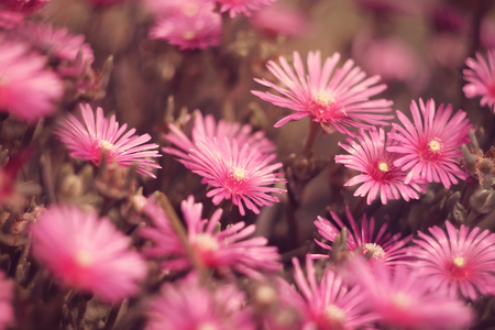 Closeup of pink flowers on a full bloom spring day. Wild mountain flower in South Africa called Ice Plant (in latin Lampranthus spectabills).Plant life and vegetation