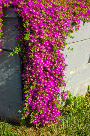 Pink iceplant flower or Hardy Ice Plant bright purple flowers on flowerbed in the garden