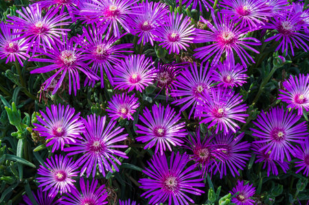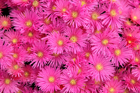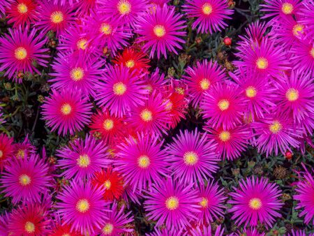 A captivating floral background of vibrant magenta Ice Plant or Delosperma flowers. The delicate, ray-like petals create a stunning, textural ground cover of continuous blooms.
