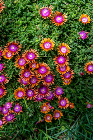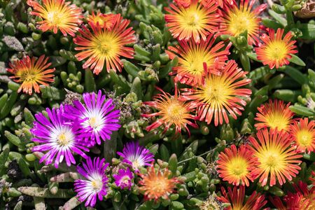 Orange and purple blooming ice plants (Delosperma cooperi) in a sunny summer flower bed