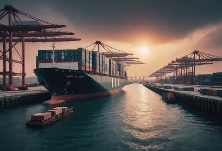 Vibrant sunset hues illuminate shipping dock with cargo containers and vessels at rest