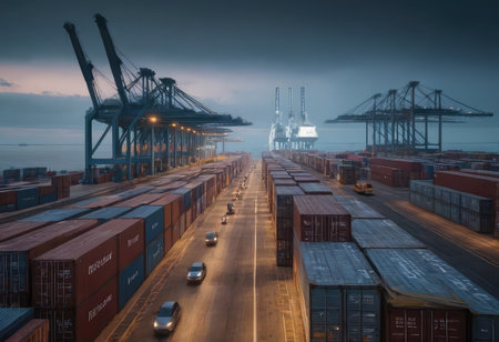 The dock comes alive at dusk with a vibrant mix of shipping containers and illuminated cranes working against a twilight backdrop. Generative AI.