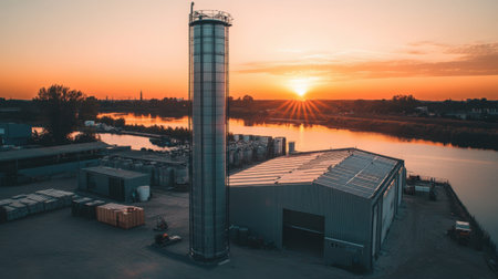 A stunning aerial view of an industrial facility featuring silos by the river at sunset, showcasing vibrant colors and tranquility in a rural landscape.