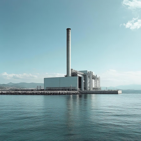 Generative AI, Offshore electricity substation, solar and wind turbine facility, ocean landscape