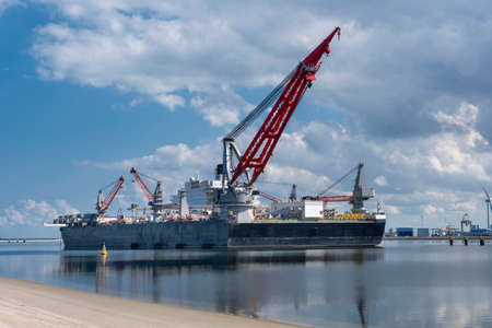 Stockholm Norvik Port, Sweden, 2020-03-18: Aerial view of installing new cranes, shipped from China to Sweden. High quality photo