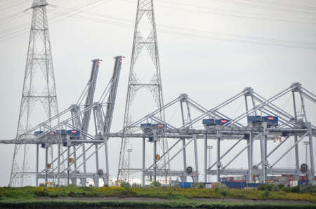 ANTWERP, BELGIUM, SERTEMBER 2018, Harbor cranes containers ships and oil tanker vessel on a sunny morning in the port of Antwerp.