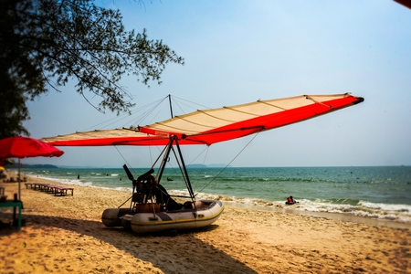 small small plane boat in the golden sands of the ochheuteal beach near the city of Sihanoukville. Cambodia